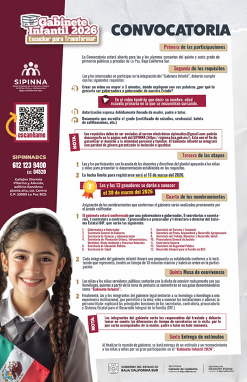La Secretaría General de Gobierno, mediante el Sistema Estatal de Protección Integral de Niñas, Niños y Adolescentes (SIPINNA), invita a estudiantes de quinto y sexto grado de primaria del municipio de La Paz a participar en la tercera edición del Gabinete Infantil 2026: “Escuchar para transformar”.