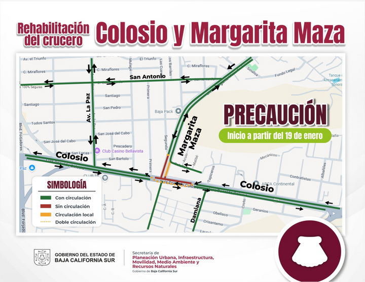 Con el compromiso de fortalecer la infraestructura urbana y garantizar la seguridad de las familias sudcalifornianas, el Gobierno del Estado, a través de la Secretaría de Planeación Urbana, Infraestructura, Movilidad, Medio Ambiente y Recursos Naturales (SEPUIMM), iniciará trabajos de reconstrucción en La Paz, específicamente en el crucero de los bulevares Luis Donaldo Colosio y Margarita Maza (Alta Tensión), a partir del lunes 19 de enero.